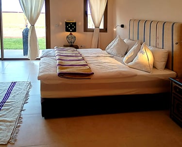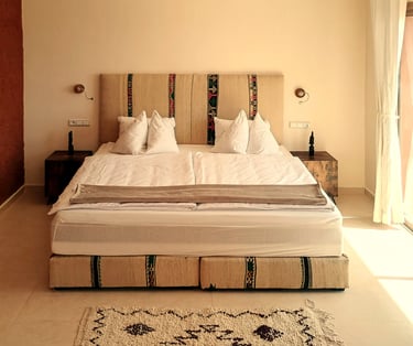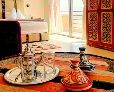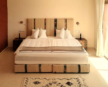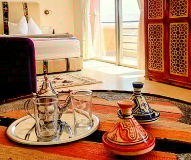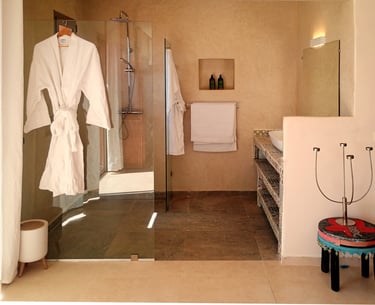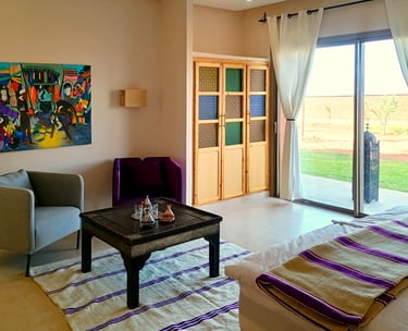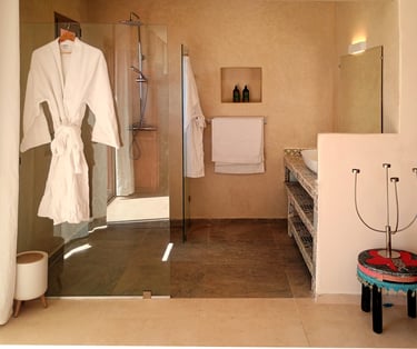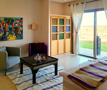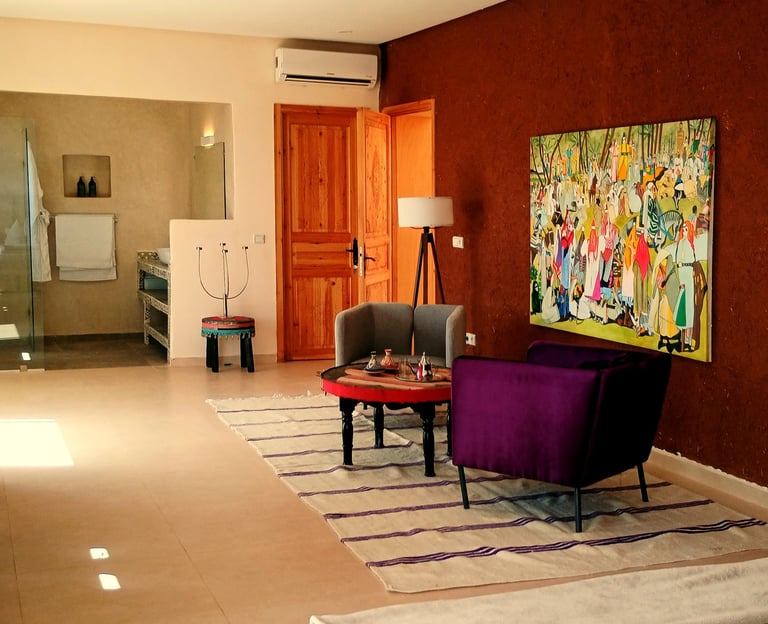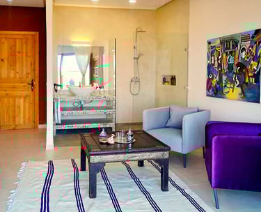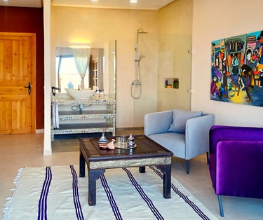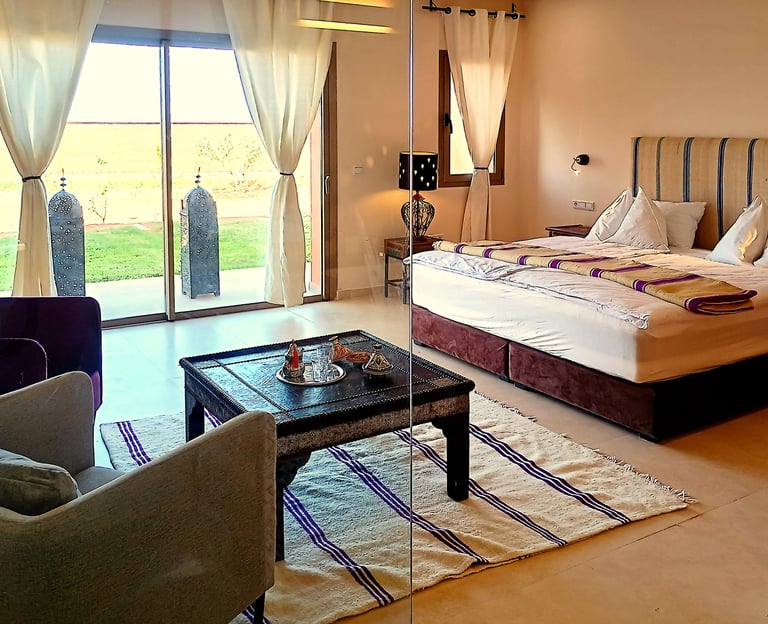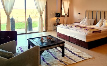 Genießen Sie den Aufenthalt in einer unserer luxuriösen Junior-Suiten mit einem Mix aus orientalischen und modernen Design, offenem Badezimmer, Terrasse/Balkon und Blick auf das Atlas-Gebirge. Ideal für Entspannung und Erholung.