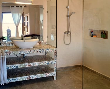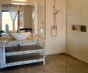 Genießen Sie den Aufenthalt in einer unserer luxuriösen Senior-Suiten mit einem Mix aus orientalischen und modernen Design, offenem Badezimmer, Terrasse/Balkon und Blick auf das Atlas-Gebirge. Ideal für Entspannung und Erholung.